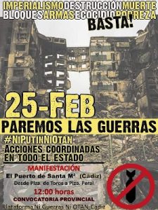Artículo que se irá ampliando con la información recibida. Ver también: Actos realizados para pedir la Paz en Ucrania en el primer aniversario de la invasión rusa El próximo viernes 24 de febrero se cumple el primer aniversario de la intervención militar de Rusia en territorio de Ucrania. En diferentes puntos del estado español hay […]