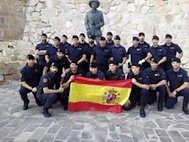 Los antidisturbios de la Guardia Civil en Melilla se fotografían ante la estatua de Franco