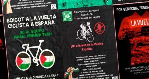 Los activistas solo interrumpieron un poco, con una pancarta en la carretera, la circulación del equipo que blanquea el genocidio de Israel. Pero Javier Guillén, director de la Vuelta se escandaliza por esa «violencia». Qué no estará cobrando de los asesinos este cómplice de genocidio, para colaborar tan torpemente con su sucia propaganda. Nota de […]