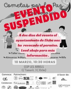 Elena Mora Hola a tod@s, Desafortunadamente nos han impedido oficialmente llevar a cabo este evento solidario, familiar y por la paz. La causa es que a dos días del evento, el ayuntamiento de Elche nos ha revocado el permiso, a pesar de que ya lo teníamos aprobado desde enero, siendo el mismo evento que tuvimos […]